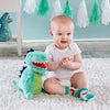 Baby boy gift sets don't have to be dull, just make sure there's a dinosaur involved! Baby Aspen's dinosaur gift set features four pieces for baby boy; a bib, mittens, plush rattle and socks. Put them all together, and you've got a great dinosaur themed baby gift! Features and facts:Color(s): Blue, green, white, red, grey and yellowMaterials: CottonDetails: Set of 4 gift set features white bib with yellow triangles and dark blue trim, and teal smiling T-Rex design; white mittens feature dark blue triangle pattern with dinosaur and volcano design; light green round rattle in the shape of a dinosaur; and light grey socks with dark blue trim and teal smiling T-Rex design. Bib, socks and mittens are machine wash cold, tumble dry low; rattle is hand wash only. Suitable for ages 0-6 months.Dimensions: 9.8" w x 2.6" d x 9.8" hSelling Unit: SetMinimum Quantity Without Personalization: 1Minimum Quantity With Personalization: N/AAssembly Required: None