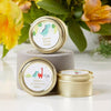 Color(s): Matte gold finish with pink, white, and gold label designMaterials: Metal tins with paper label