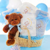 The perfect gift for newborn babies includes everything that is needed to make baby comfy and happy. Washcloths, toiletries and a soft satin lined blanket which can be personalized accompany the bag in blue and white with brown trim. The stylish striped bag keeps everything organized and easily within reach. Plus, baby gets to make their first friend thanks to the included teddy which is just the right size for the little one’s nap time cuddles.