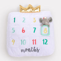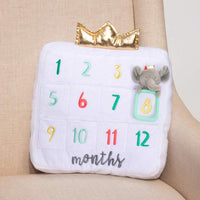 Made from soft white velour and featuring 12 numbered month pockets. Also included is a plush elephant holding a golden ring, which can be placed in a pocket with the ring highlighting your chosen month. While the surface toy requires simple surface wash care, the pillow can be maintained with a quick machine wash cold and tumble dry low process!